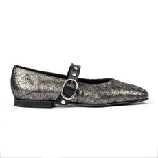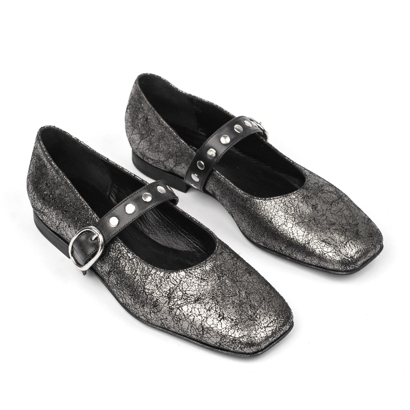 Chatita clasica. Material Cuero vacuno metalizado detalle de tira con tachas. Altura de taco 1.5cm
