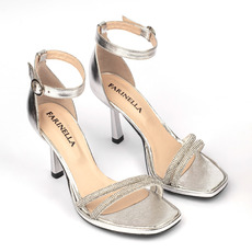Sandalia. Material cuero vacuno metalizado y faja de strass taco pintado al tono. Altura de taco 8cm Altura de plataforma 1cm