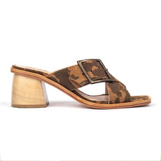 Sandalia. Material cuero vacuno print detalle de hebilla cuadrada al tono. Taco de madera Kiri y suela Altura de taco 5cm