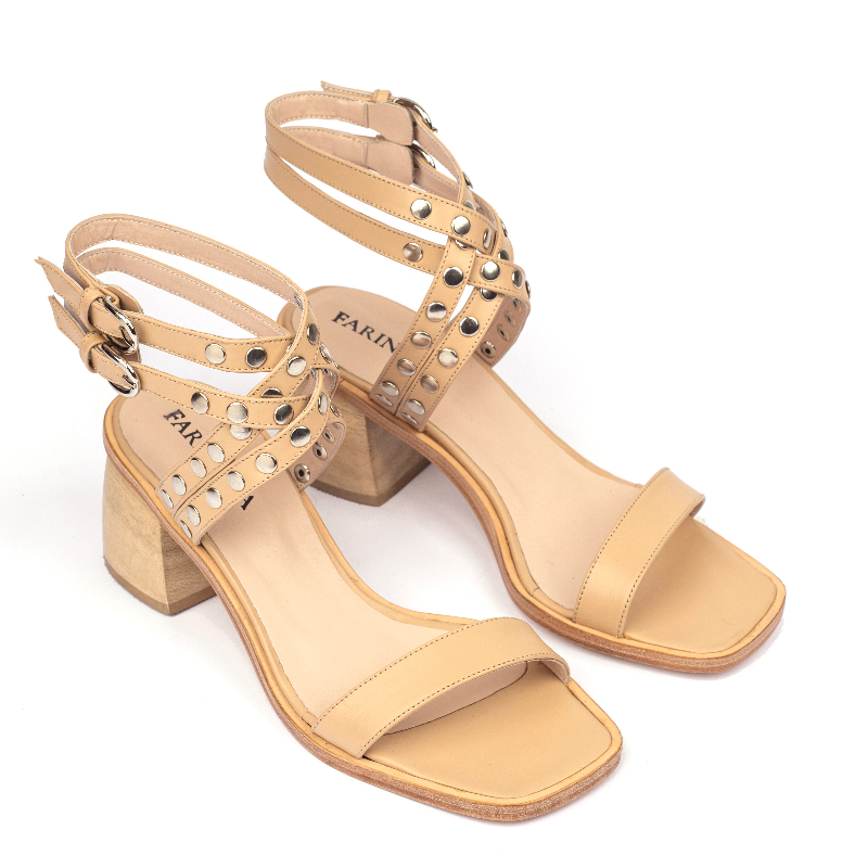 Sandalia. Material cuero vacuno pulsera doble tira con detalle de tachas. Taco de madera Kiri y suela Altura de taco 5cm
