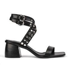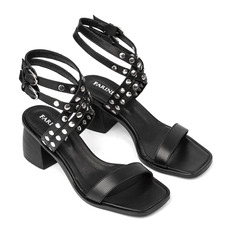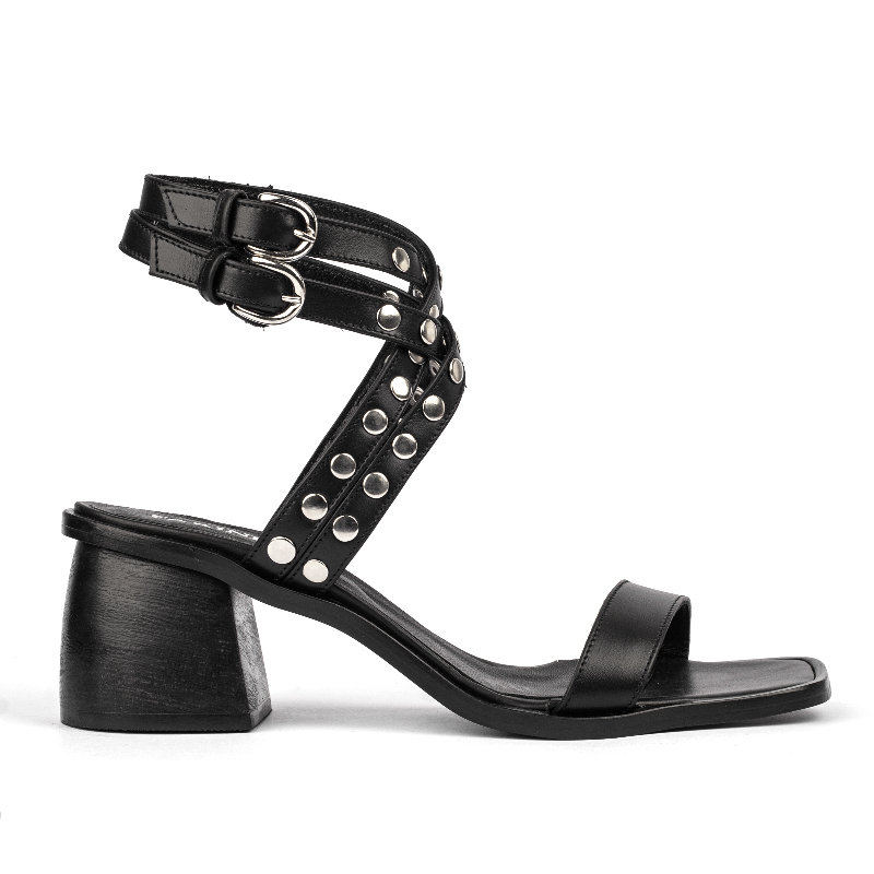 Sandalia con taco de madera y fondo de suela. Material cuero vacuno, detalle de tachas en las tiras de pulsera y doble hebilla. Altura de taco: 5,5cm