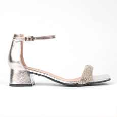 Sandalia. Material cuero vacuno metalizado faja strass. Altura de taco 3.5cm