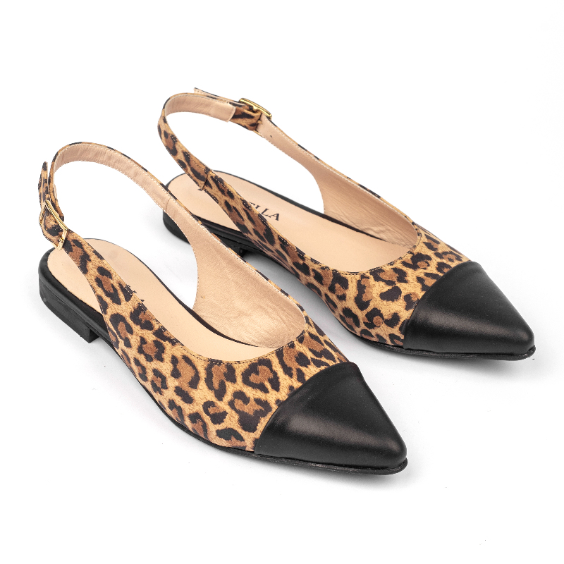 Chatita con puntera combinada. Material Cuero vacuno print. Altura de taco 1.5cm